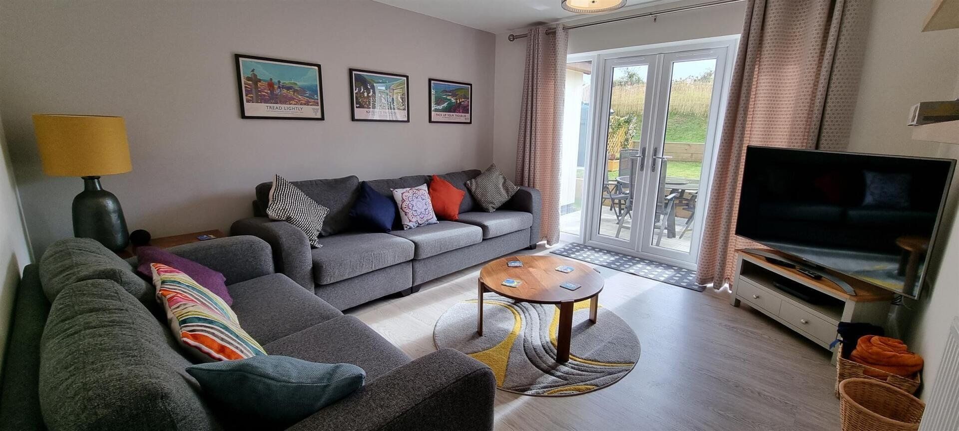 The rear-aspect lounge is furnished with large sofas and a 55" smartTV. French doors open up onto the patio and south-facing garden which backs onto fields beyond.